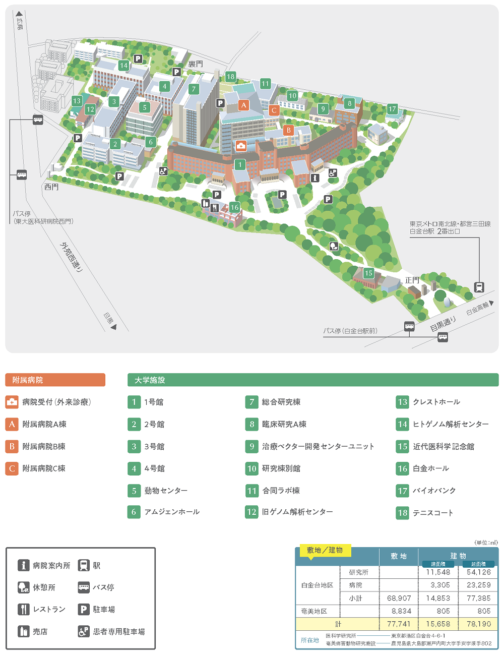 | B | JR山手線目黒駅東口から徒歩15分。JR山手線目黒駅東口から都バス品93大井競馬場行で、白金台駅前下車。 あるいは、都バス黒77千駄ヶ谷行または橋86新橋駅行で、東大医科研病院西門下車。 |